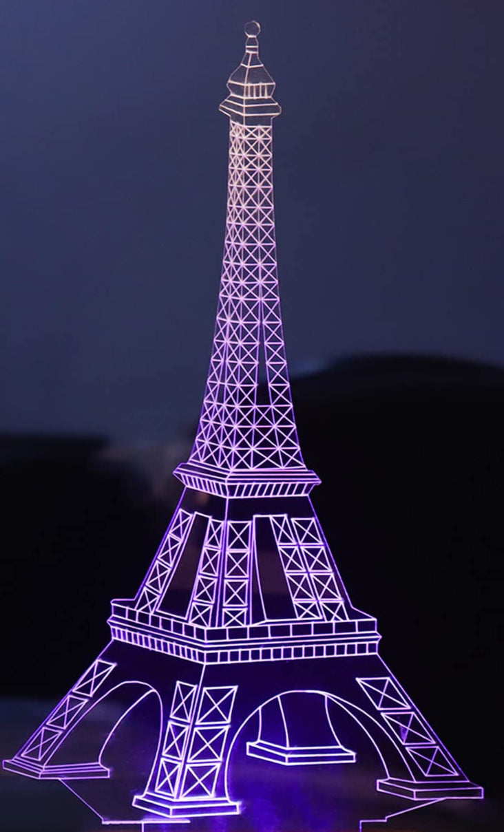 This stunning Eiffel Tower LED illusion lamp is the perfect blend of art and light. Crafted using precision CO₂ laser-cut acrylic, this decorative piece mimics a 3D effect while glowing beautifully in ambient hues.